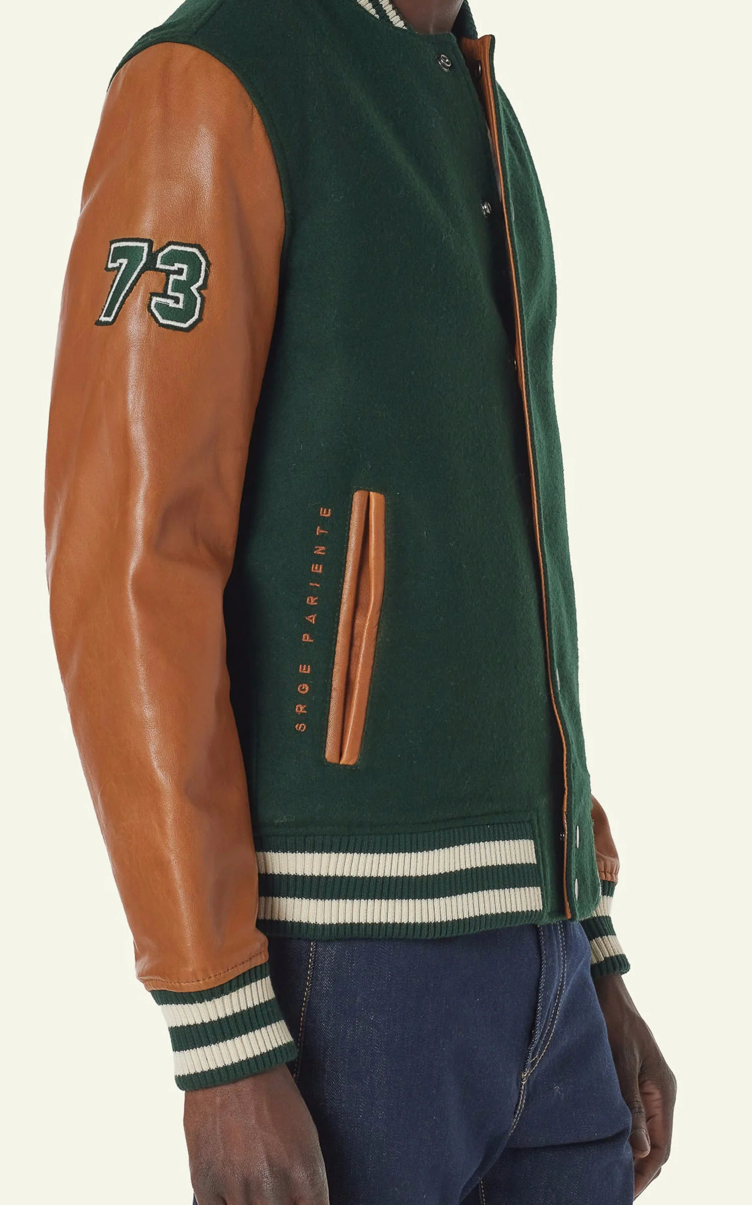 Blouson teddy bi matière cuir et laine modèle Varsity de la marque Serge Pariente.