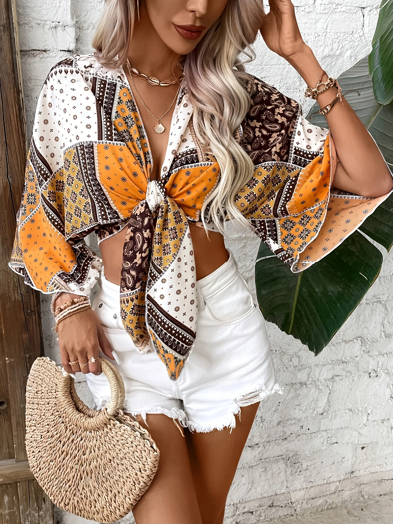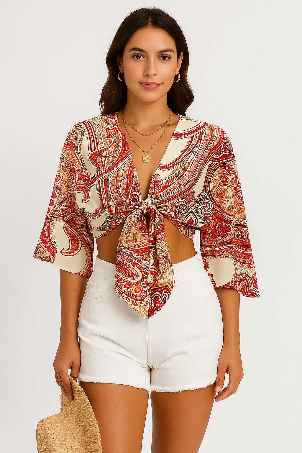 Top bohème femme noué à l’avant manches larges imprimé foulard, fluide et léger. Une pièce estivale pleine de caractère pour un look solaire et décontracté.