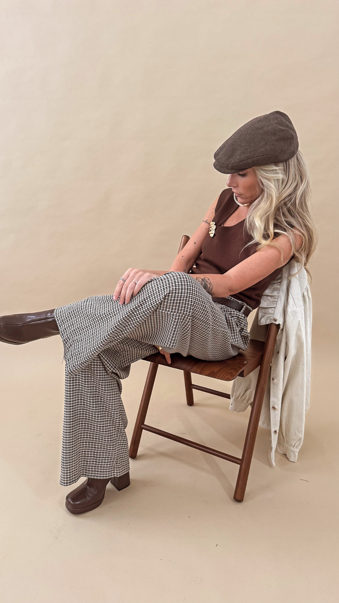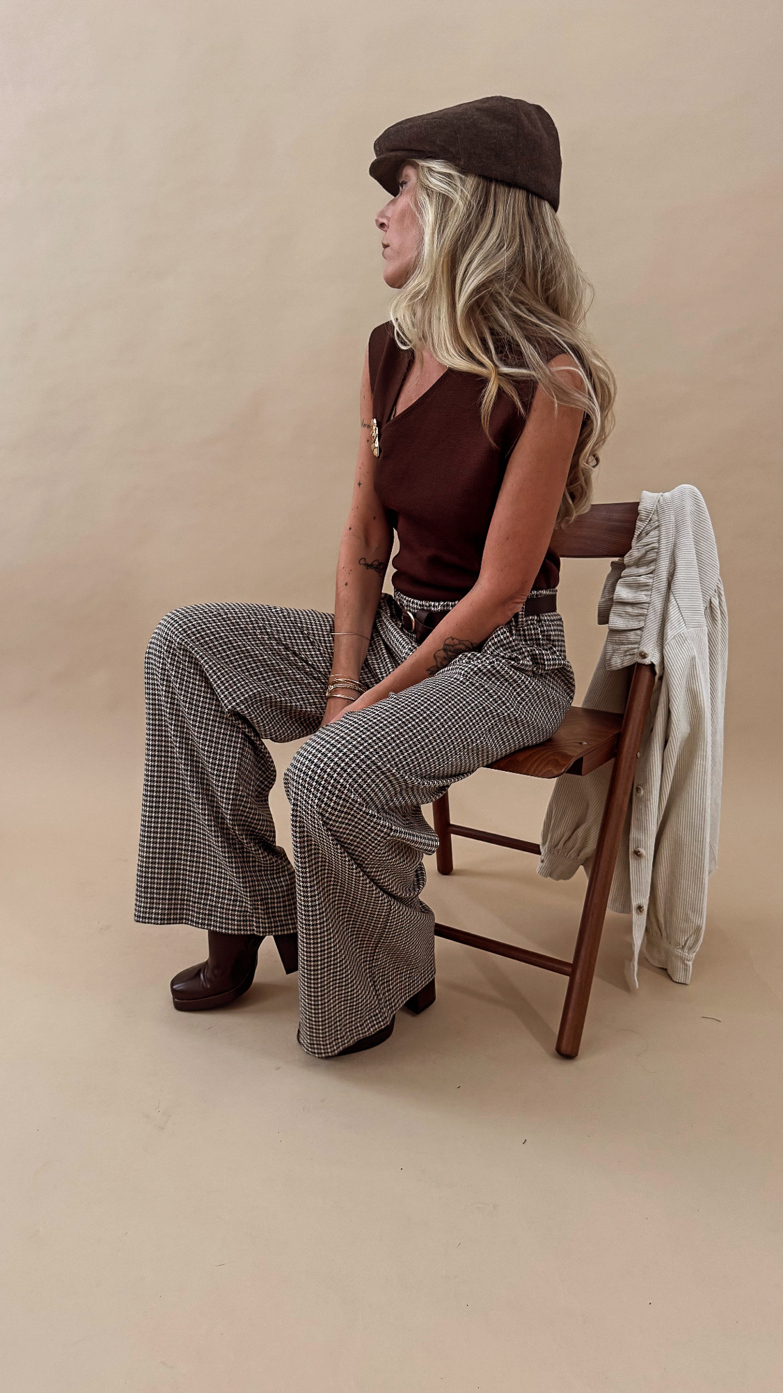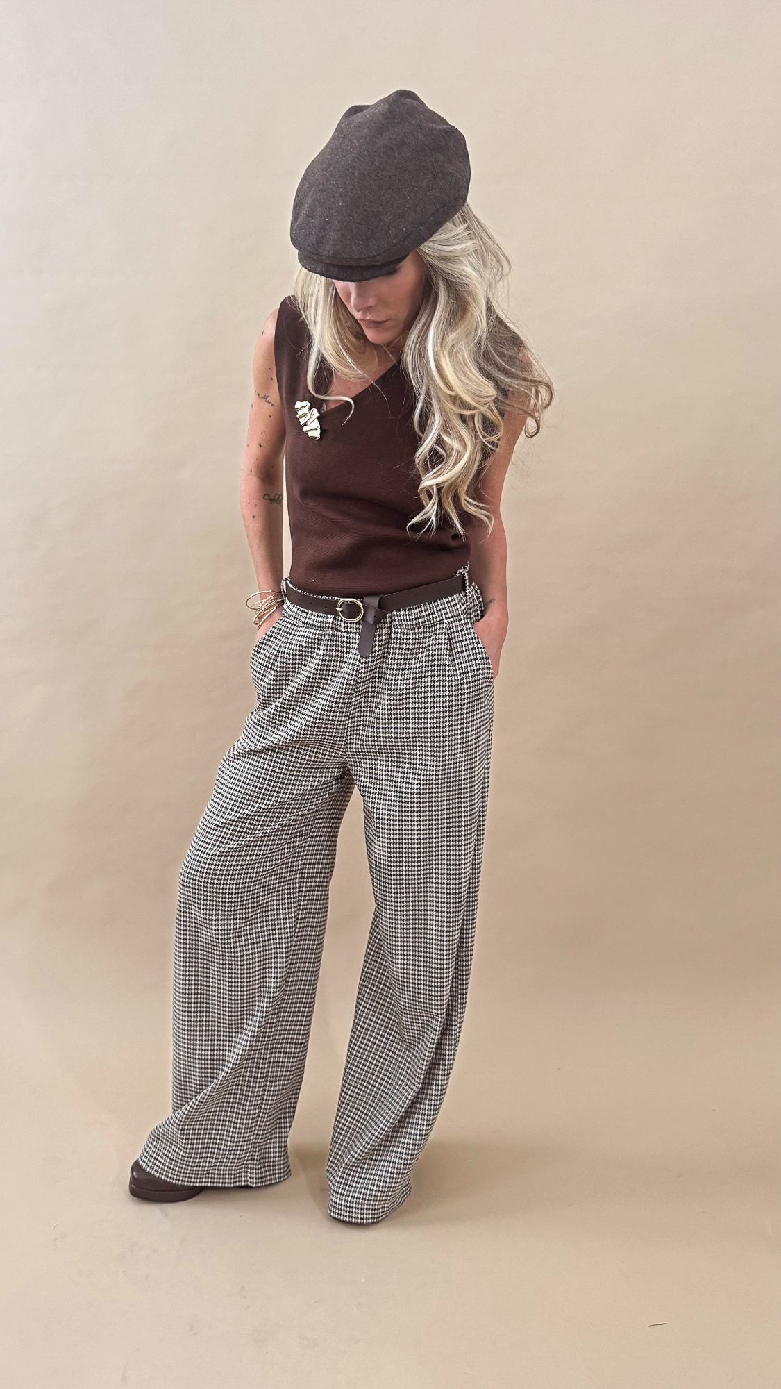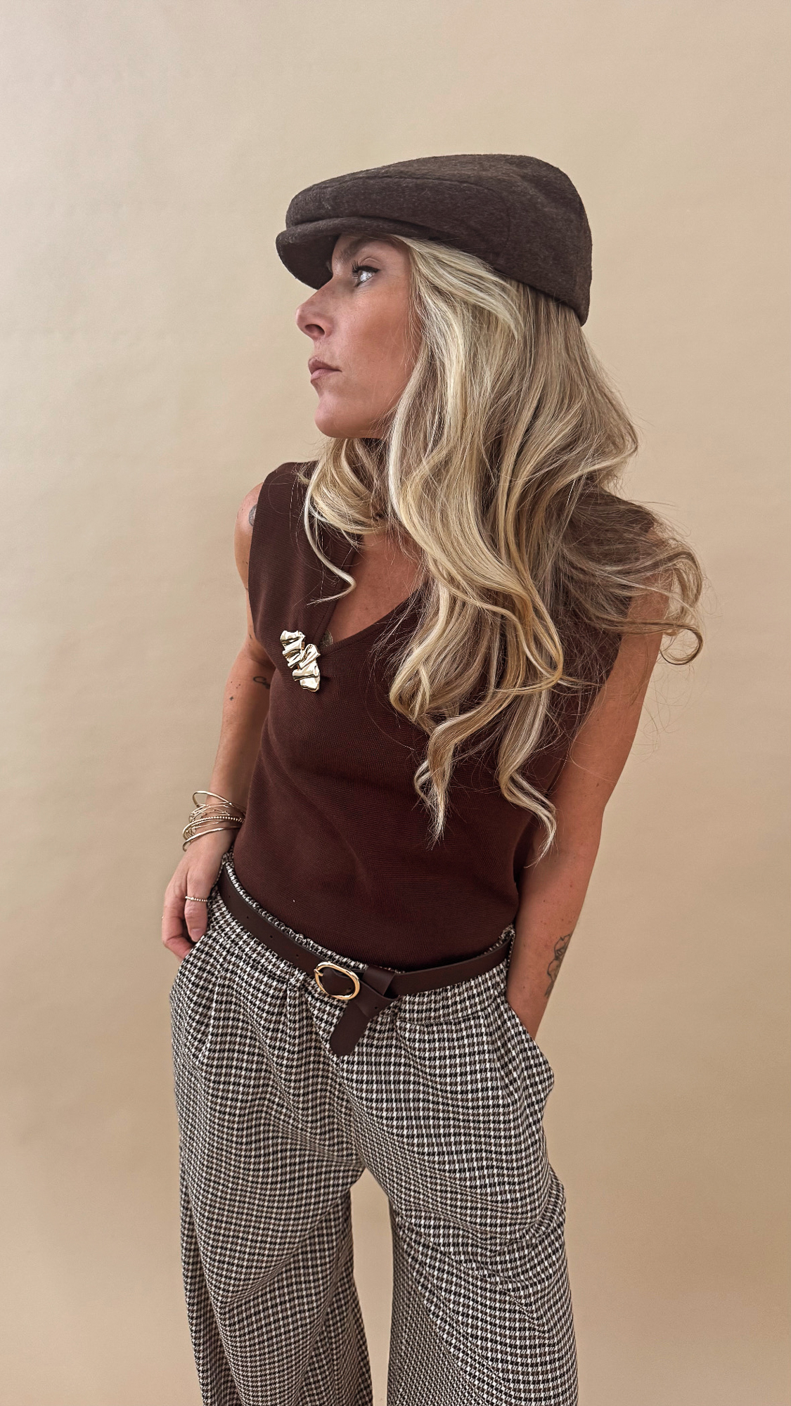 Le top marron sans manche en maille fine et élastique, coupe sobre avec une encolure en V ornée d’un bijou doré plissé. Chic et confortable, idéale au quotidien comme en soirée !