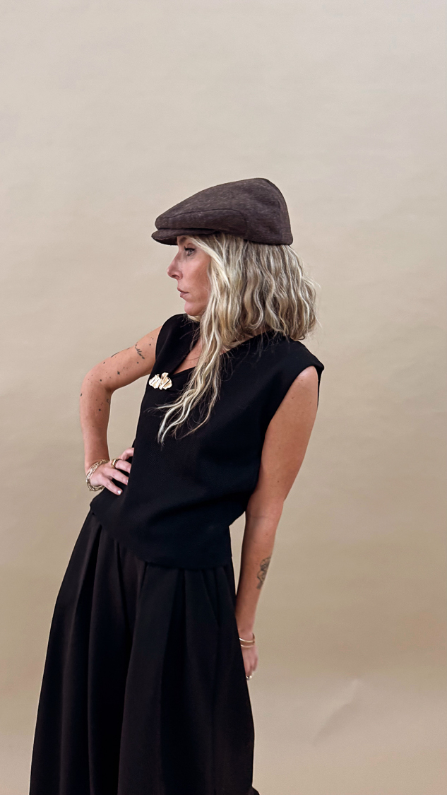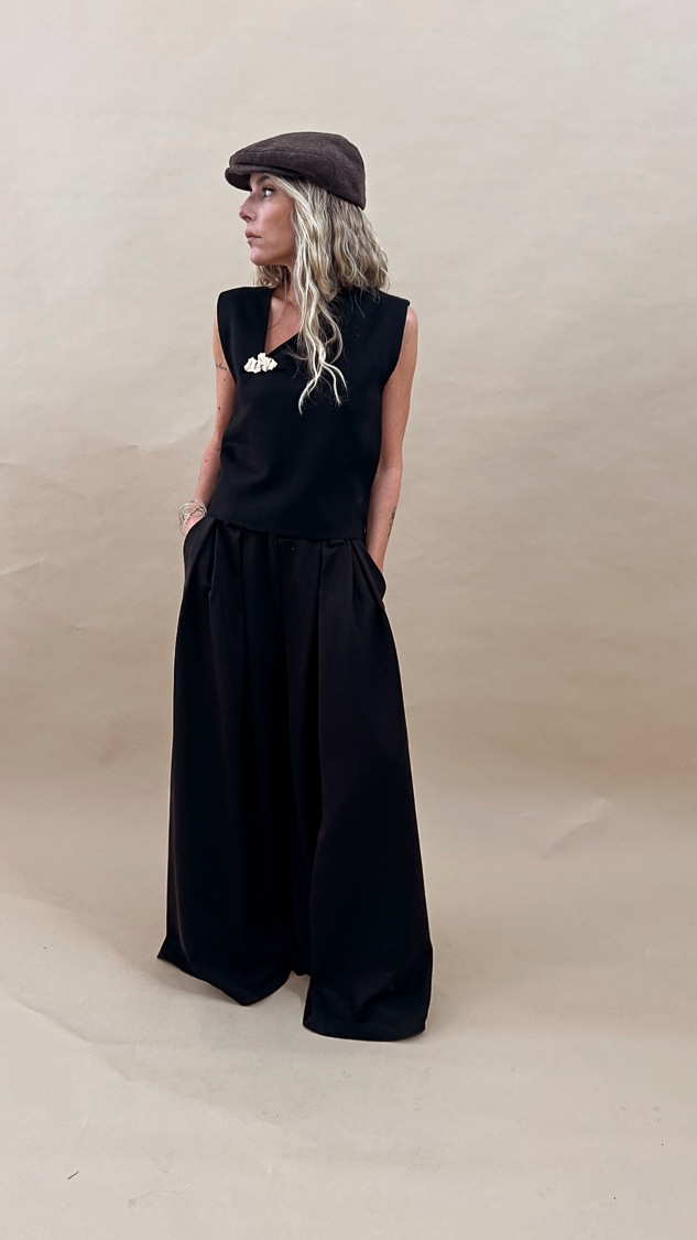 Le top noir sans manche en maille fine et élastique, coupe sobre avec une encolure en V ornée d’un bijou doré plissé. Chic et confortable, idéale au quotidien comme en soirée !