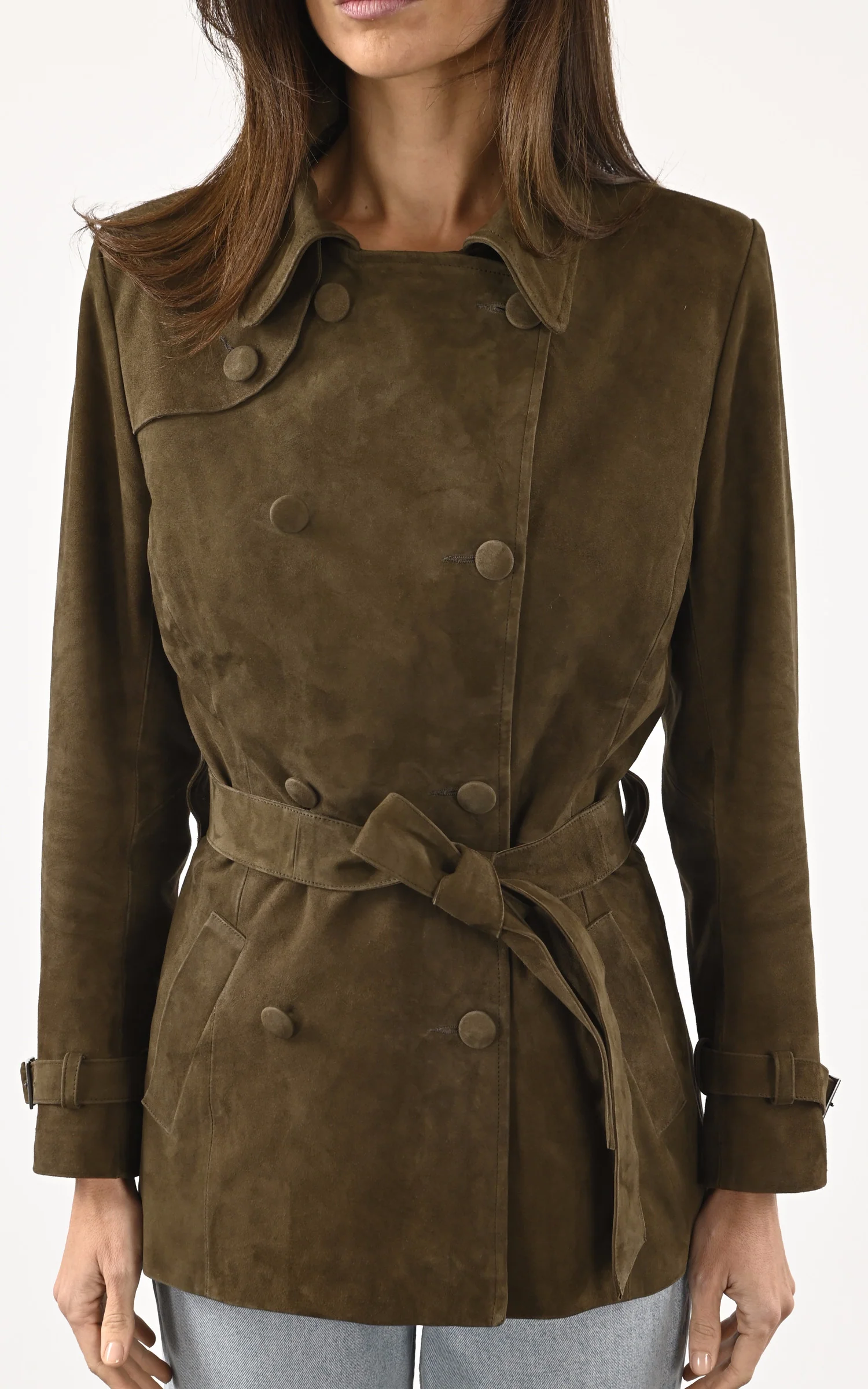 Trench court en cuir souple de chèvre aspect velours