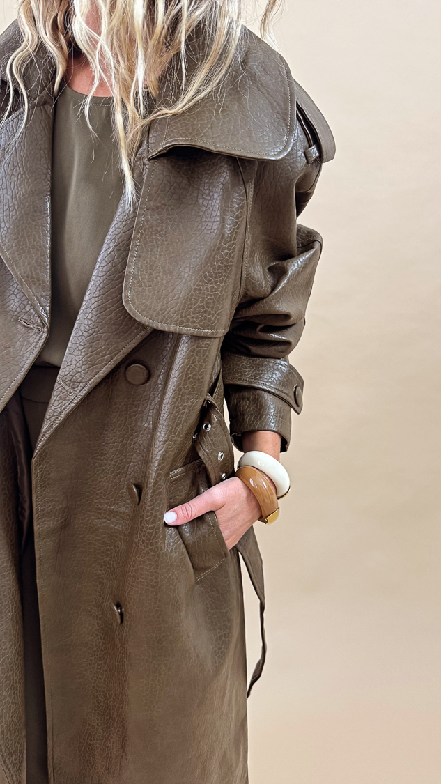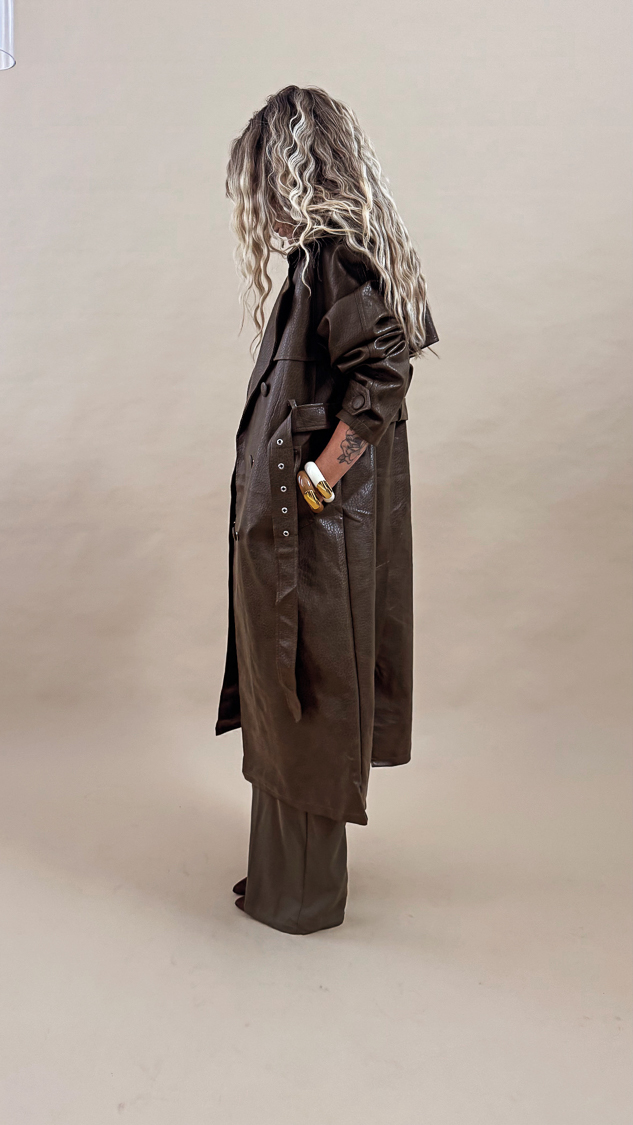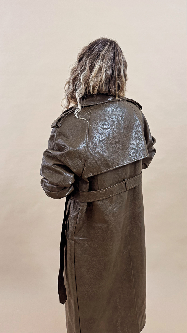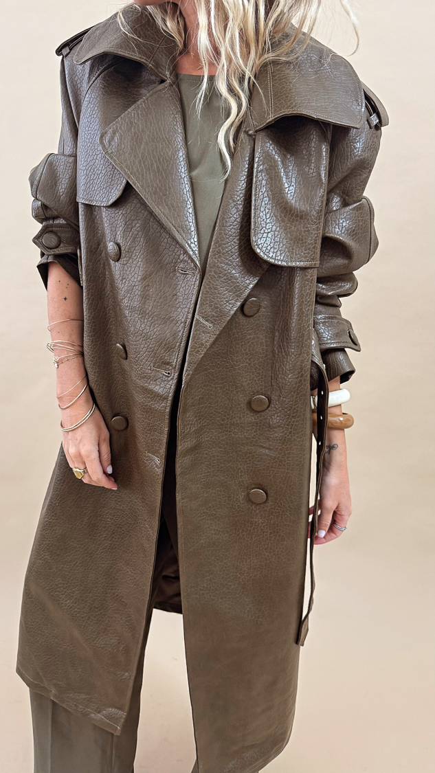 Élégant et audacieux, ce trench long en simili cuir kaki est la pièce parfaite pour sublimer vos looks de mi – saison !