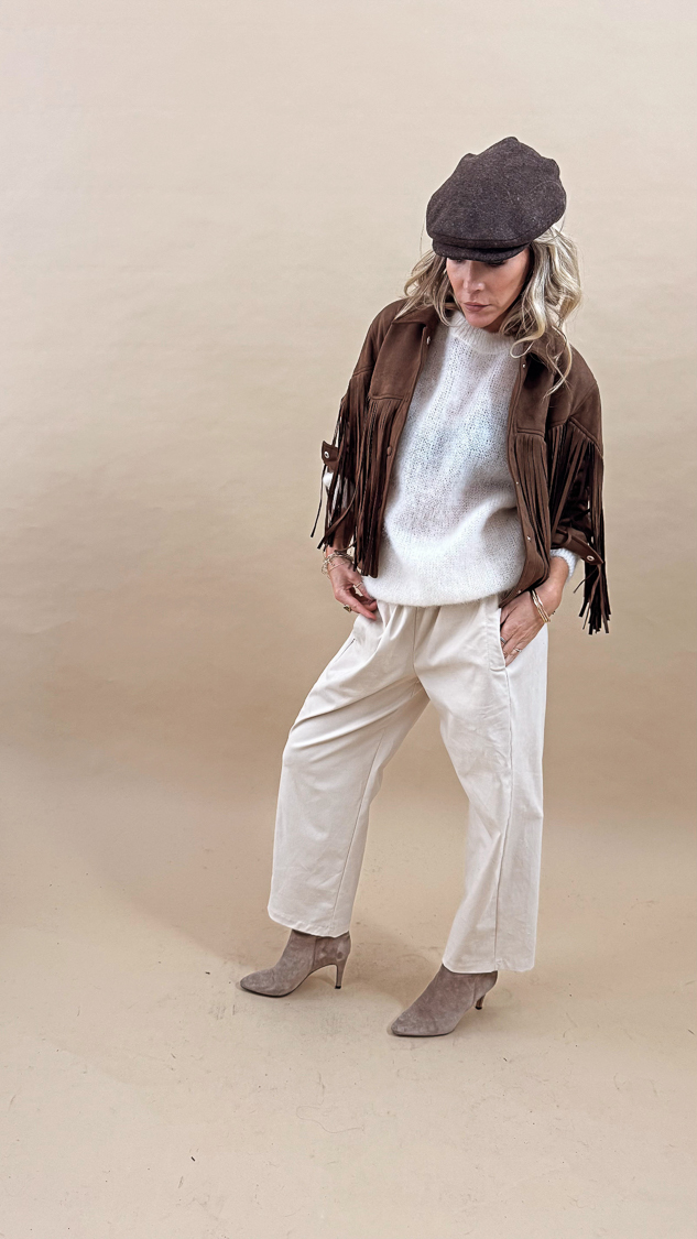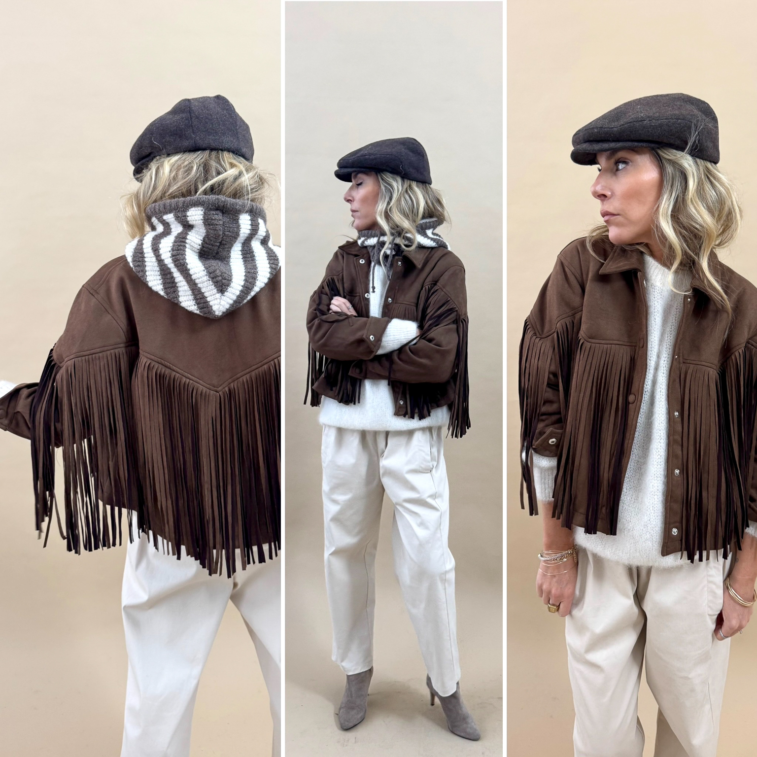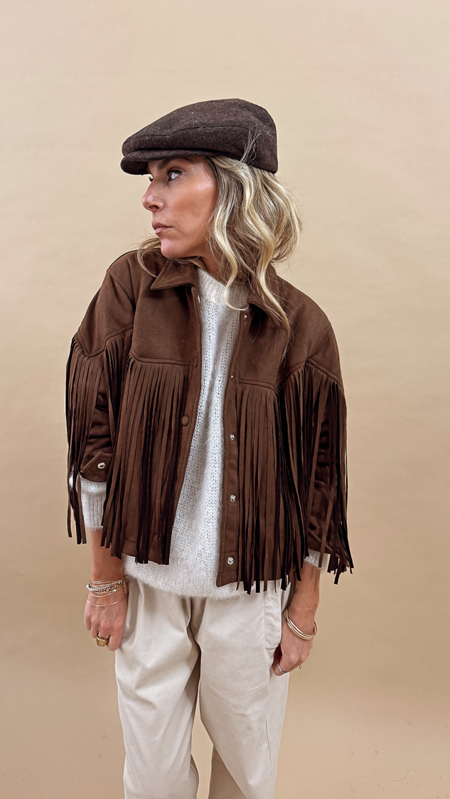 La veste marron à franges, sa matière douce façon velours/daim et ses boutons pressions !