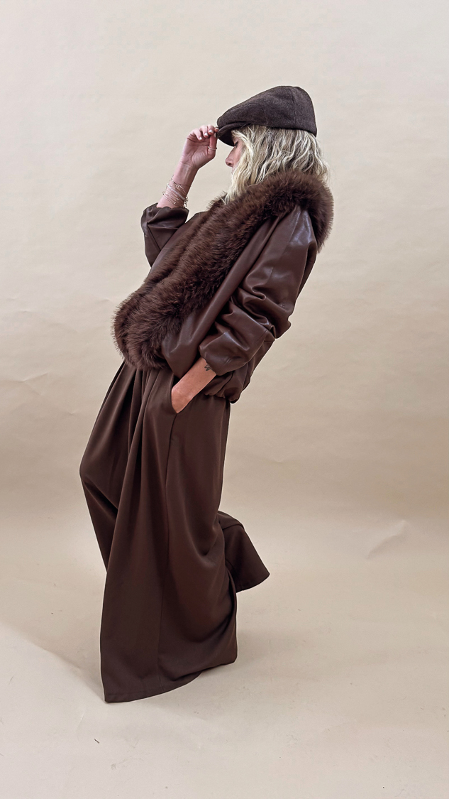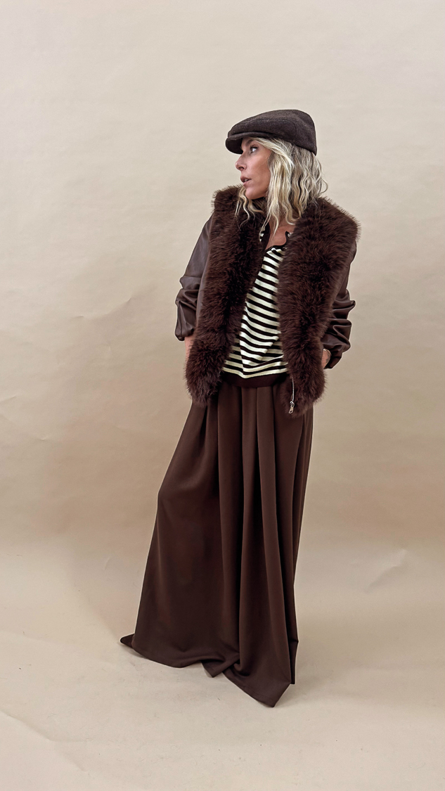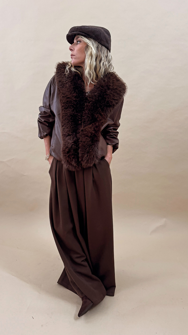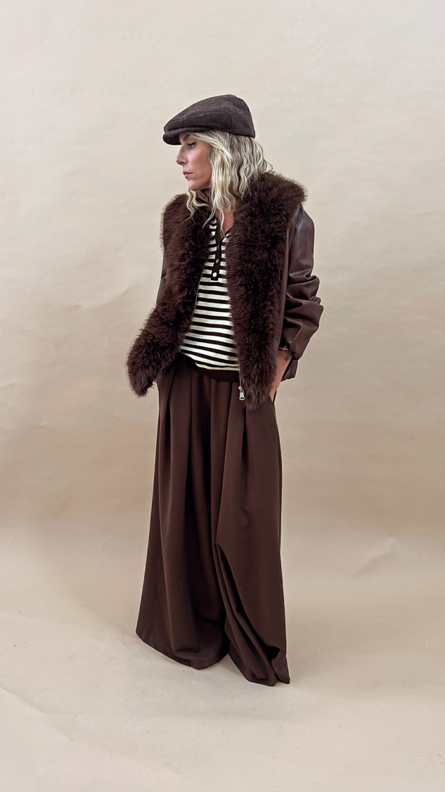 La veste marron en simili-cuir, sa forme retroussée en bas légèrement bomber et son col en fausse fourrure allie style et élégance pour la saison automnale !