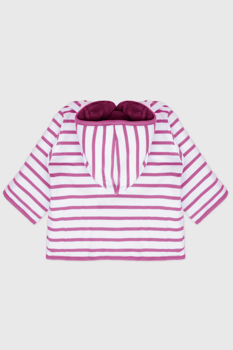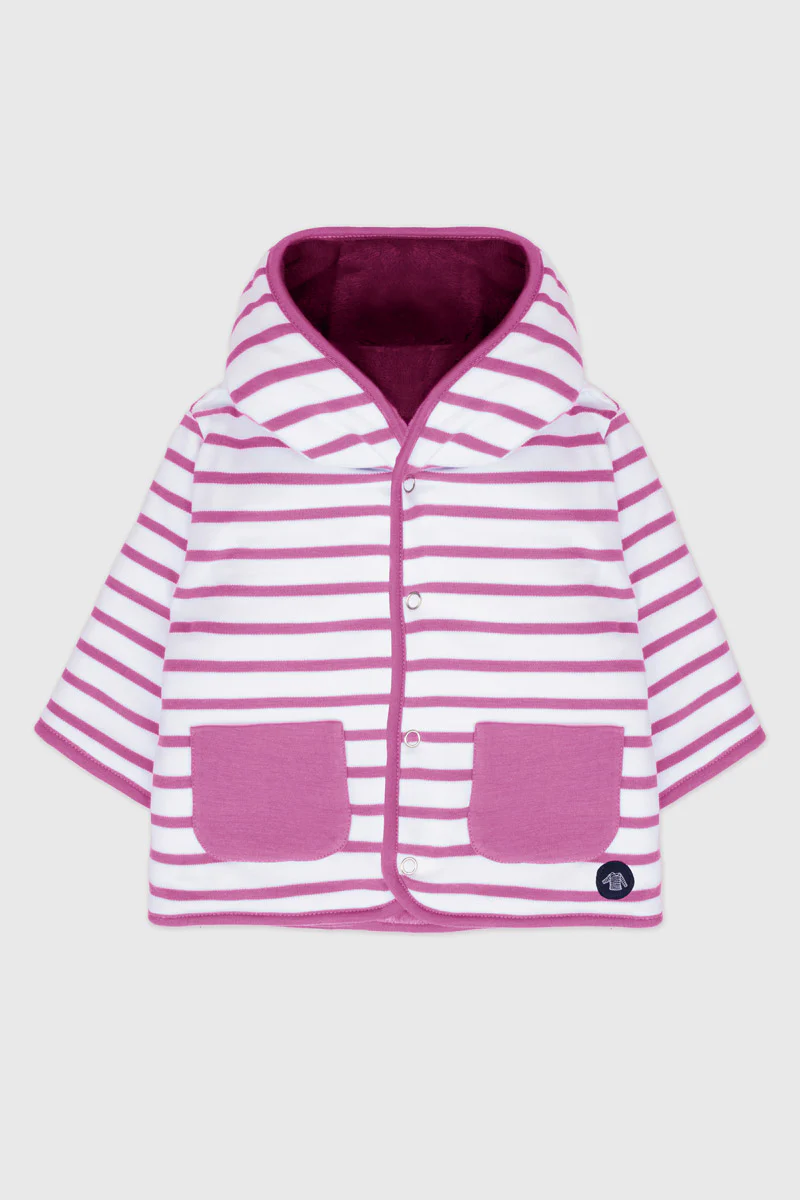 Bien chaude grâce à son aspect molletonné, cette veste réversible suivra bébé partout cette saison.
