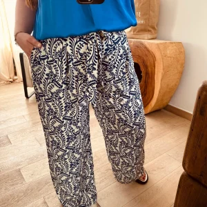 PANTALON LARGE FLUIDE À MOTIFS ECRU & BLEU